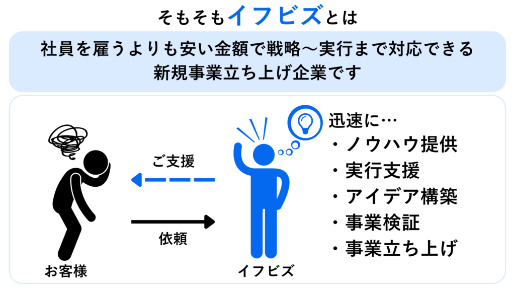 イフビズは戦略と実行の両輪を持ち、加えて自社でもビジネスを作っているため、総合力の高い提案が可能です。そして、採用するよりも、総合コンサル会社よりも安価にサービスを提供しています。